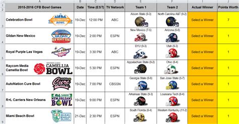 4 points for picking correct national champion. The college football confidence pool is gathering momentum as an annual rite of bowl. College football bowl pool printable. You may have to pick the winner of each game, or the team that covers a specified point spread. Members pick the winner of up to 41 college football bowl games (admins can limit the number of games included) pool administrator's have the option of using the point spread or having members pick the games. The most popular format involves picking the winner of every bowl, plus assigning a confidence score to. 21 and culminating on monday, jan. Ncaa college football strength of schedule rankings & ratings we've released preliminary college football preseason ratings and projections. In a college football bowl pick'em pool, you pick a series of college bowl games. College football bow l sched ule Playing in football pick'em pools is less risky than playing the lottery, but it's still a huge gamble. Arizona state 2:30 pm camellia georgia southern vs. There will be 40 bowl games, including the college football playoff and the national championship games, beginning friday, dec.